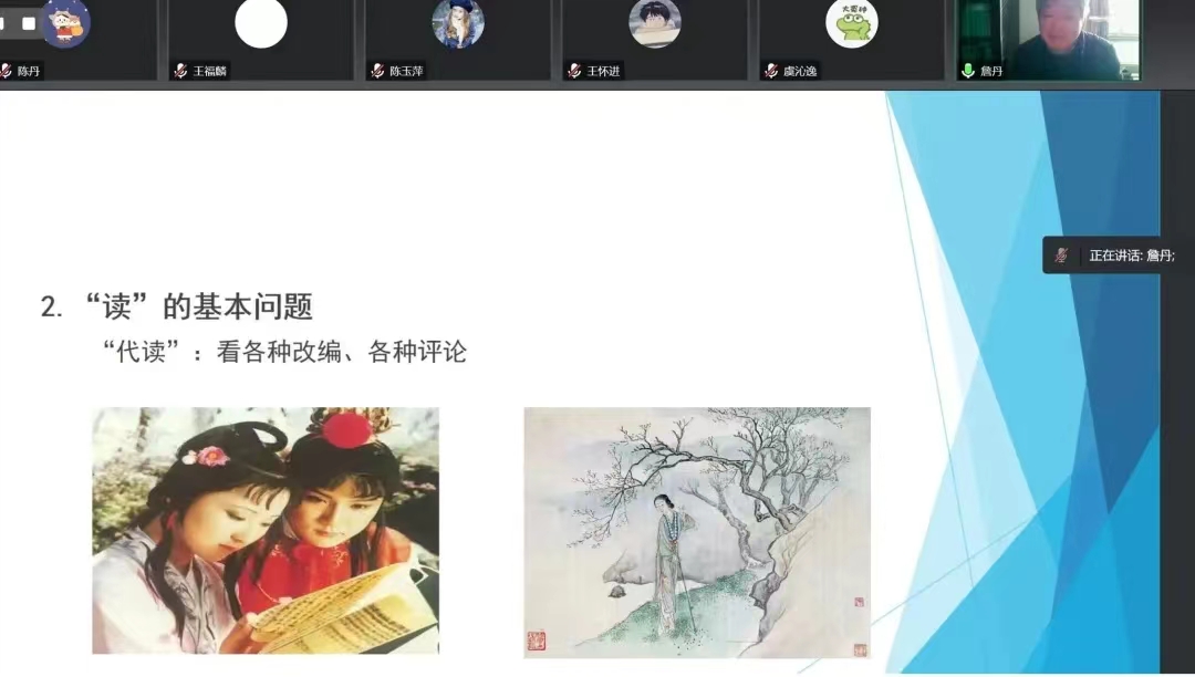 什么是通读?为什么要通读?如何读通《红楼梦》?2023年1月12日下午, 人文学院教授、博士生导师詹丹为 附属中学宝山分校带来了精彩的专题讲座《〈红楼梦〉:从通读到读通》,全体师生云端相聚。