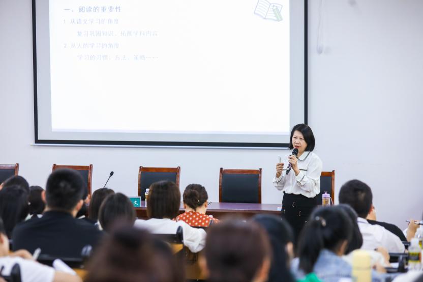 下午,章健文老师做《营造阅读氛围 提升阅读素养》专题报告,章老师从认识阅读的重要性、开展校园阅读活动的责任主体、如何开展校园阅读活动、通过校园阅读发展学生综合素养等方面系统全面地介绍如何通过阅读教学助力学生思考,提升学生阅读素养。