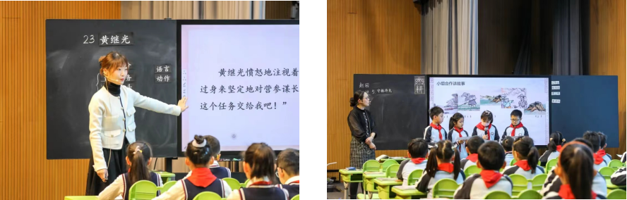上师大嘉定附小语文教师王琳和张燕根据前期分组研究的主题,分别执教了公开课四年级第二学期第七单元《黄继光》和三年级第二学期第二单元《守株待兔》,尝试探索叙事类记叙文和寓言文本的阅读策略。课后,两位老师交流了自己的教学设计意图,并进行了教学反思。