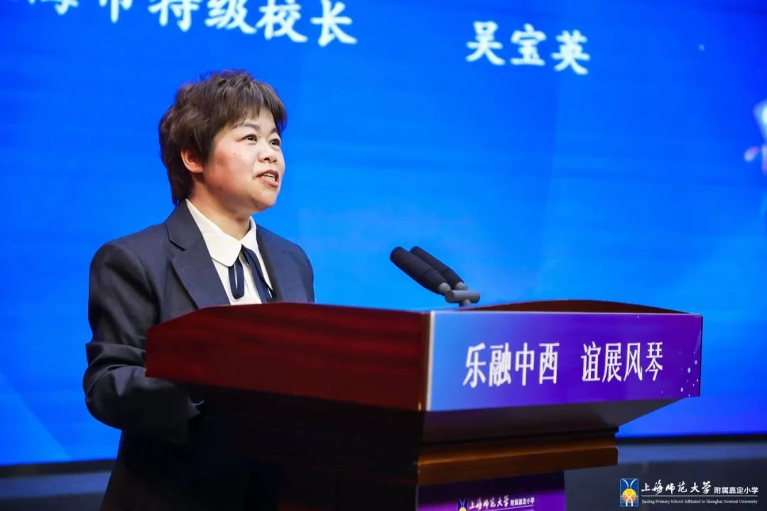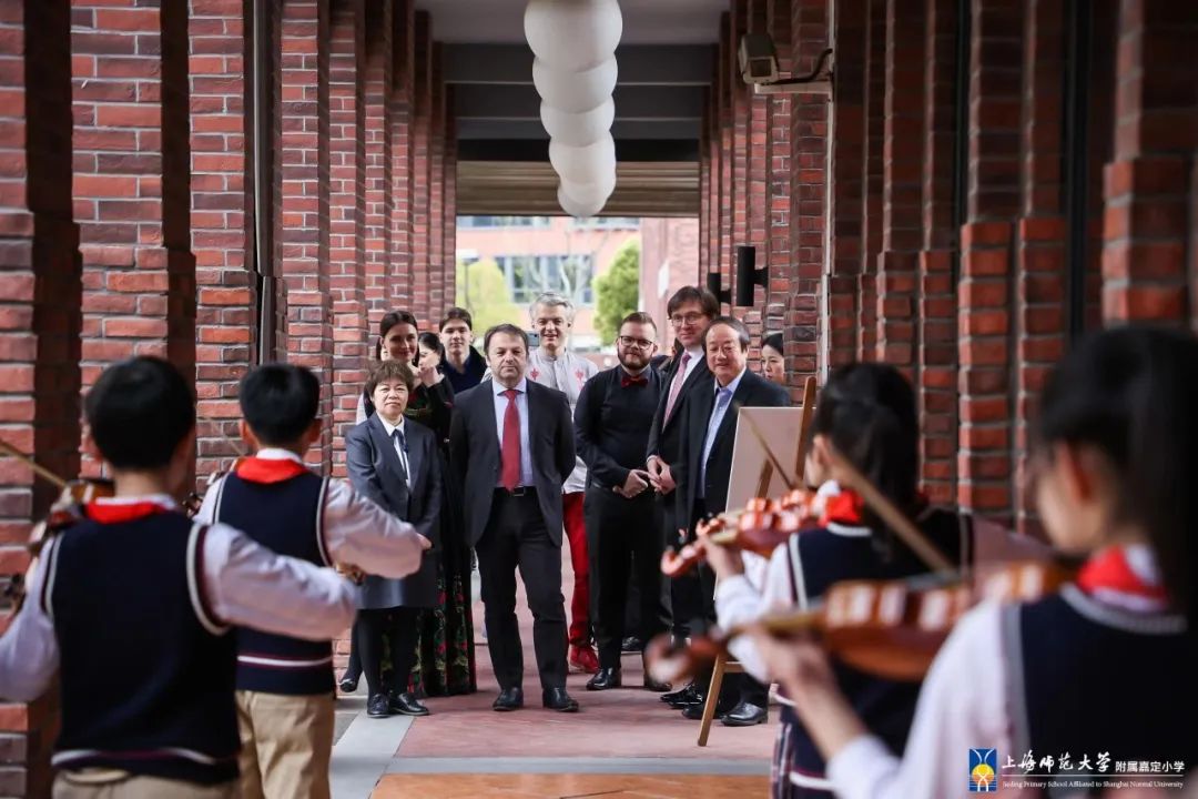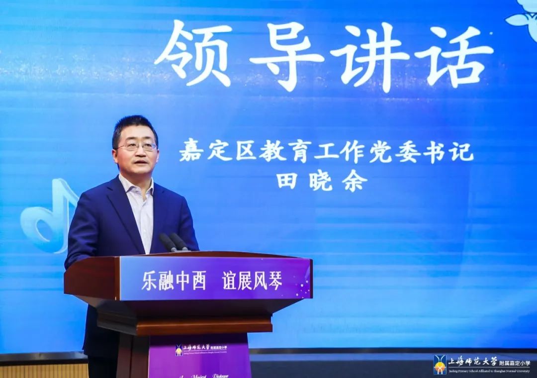 嘉定区教育工作党委书记田晓余代表嘉定教育人对外国友人的到来表示诚挚感谢!肯定了上师嘉小自开办以来,坚定地致力于艺术文化的多元发展和校园生活的丰富创意,以美奠基学校发展,以美烘托学校文化,以美践行立德树人;诚挚祝愿上师嘉小继续发挥好集团和学区两个牵头校的重任,不断用“美”点燃孩子们的梦想,浇灌孩子们的心灵,指引孩子们的生长。