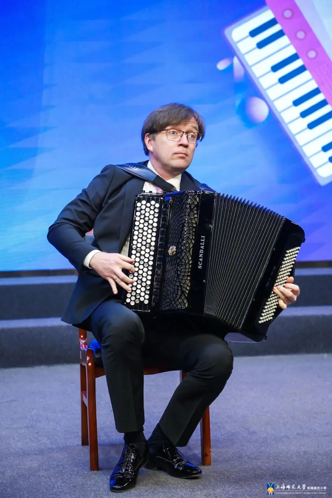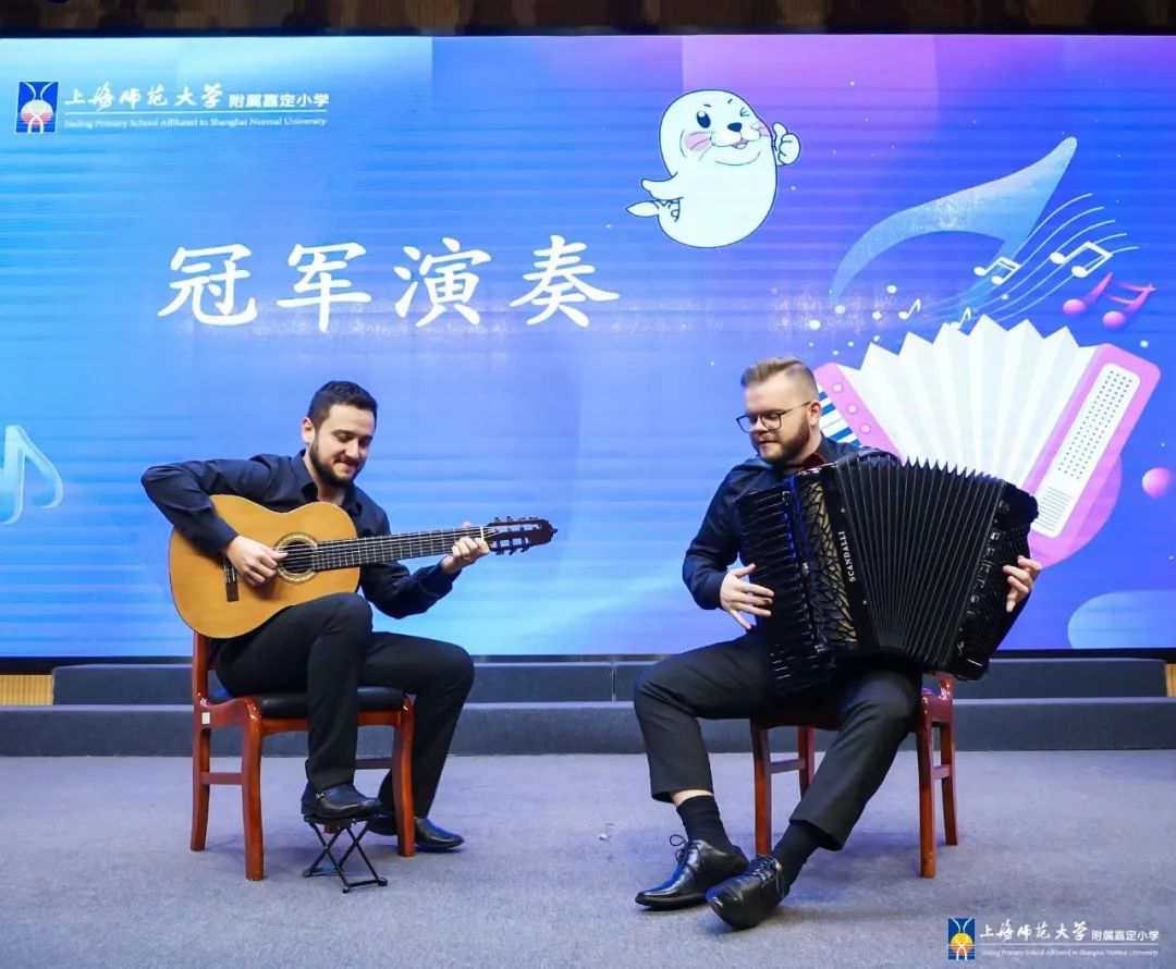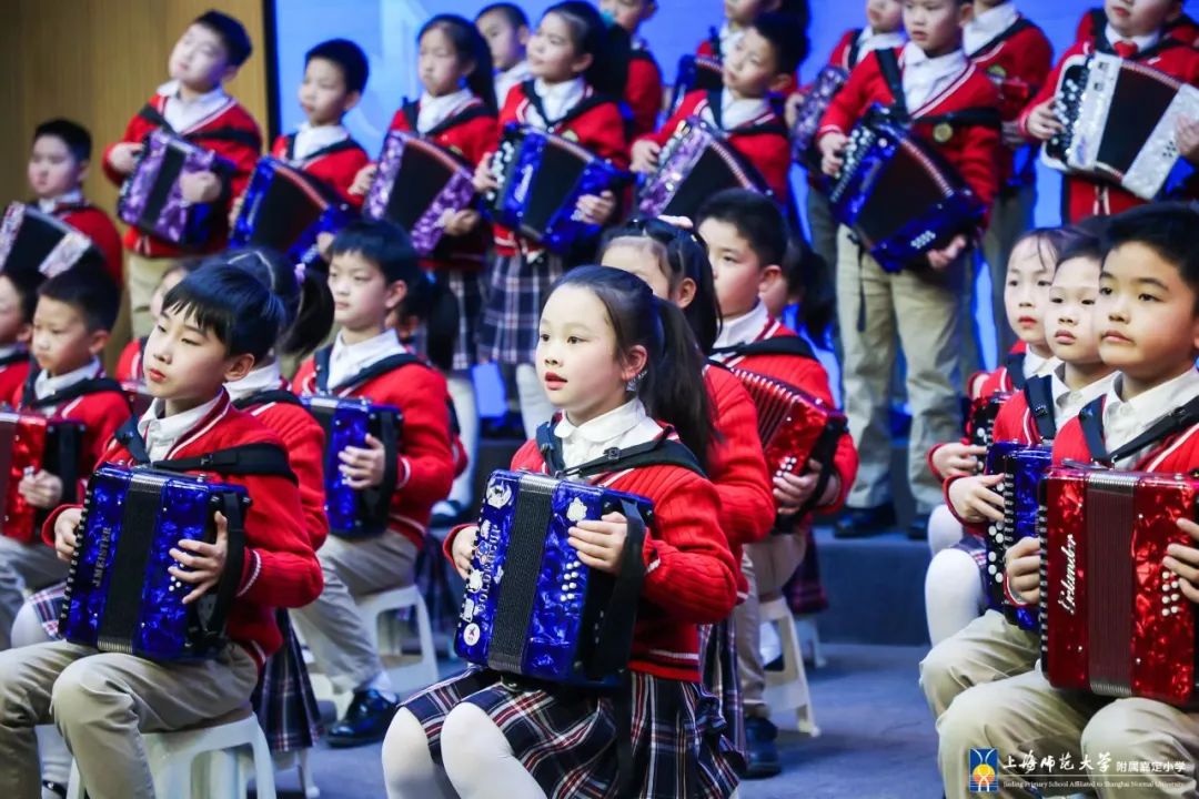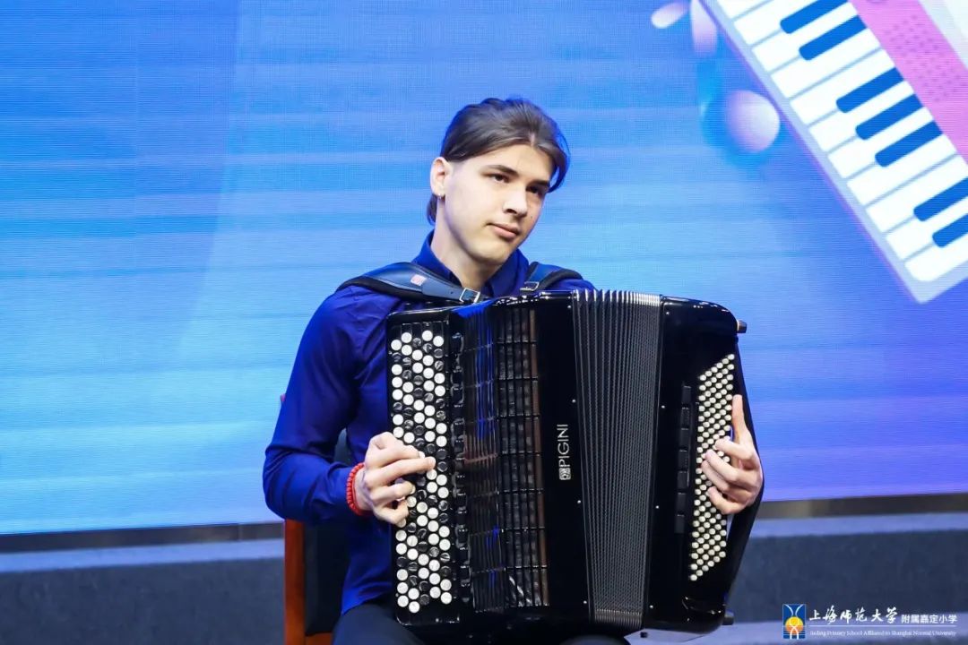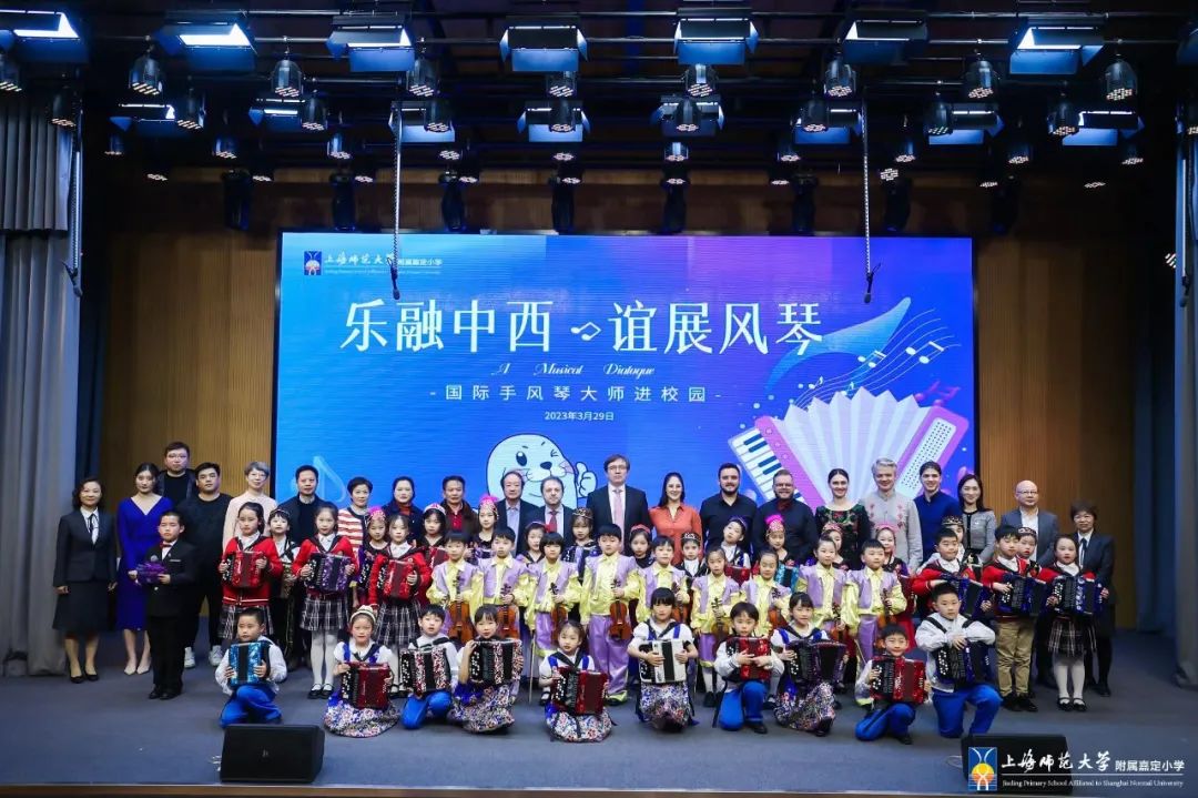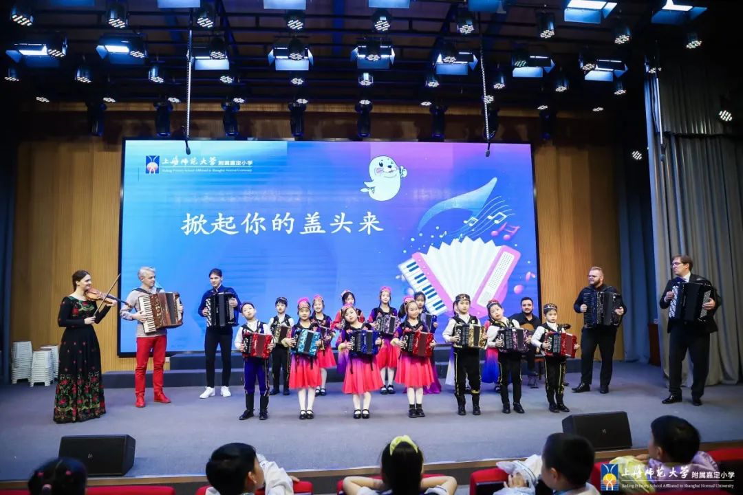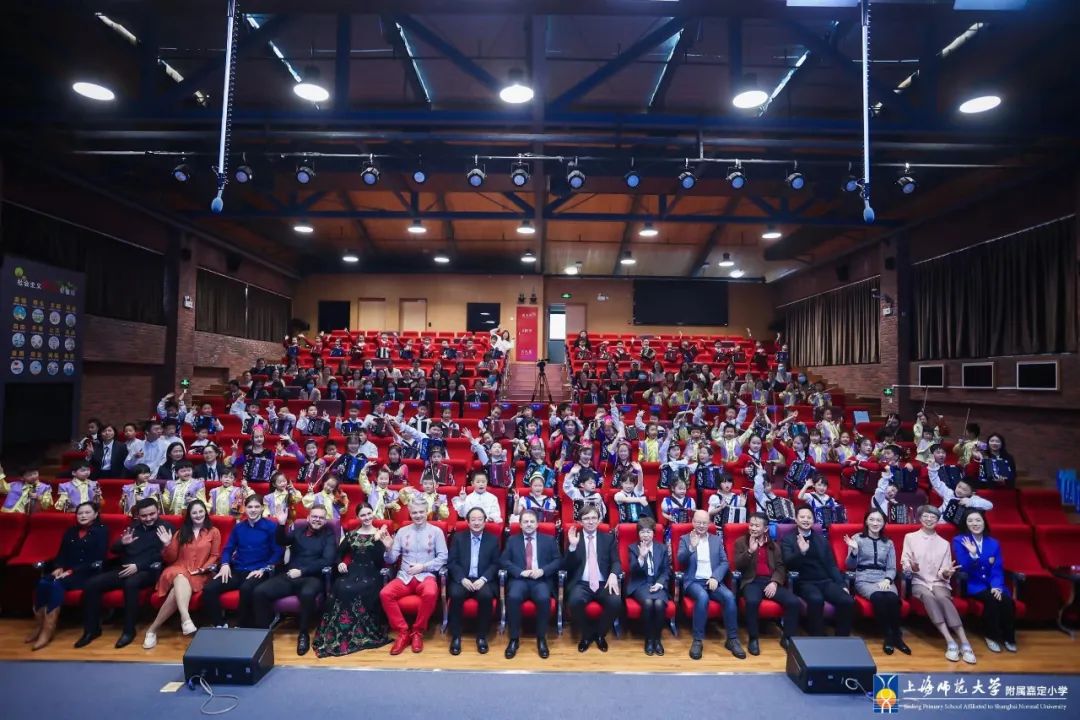 329日下午,在国际手风琴联盟副主席、中国音协手风琴学会会长李聪陪同下,国际手风琴联盟主席米高·帕特里尼,国际手风琴联盟艺术委员会主席、俄罗斯格涅辛音乐学院民乐系主任亚历山大·谢利瓦诺夫,以及波兰、塞尔维亚、巴西等“一带一路”沿线国家的世界顶尖手风琴演奏家齐聚 附属嘉定小学,让全校师生领略了一场全市瞩目的殿堂级演出。