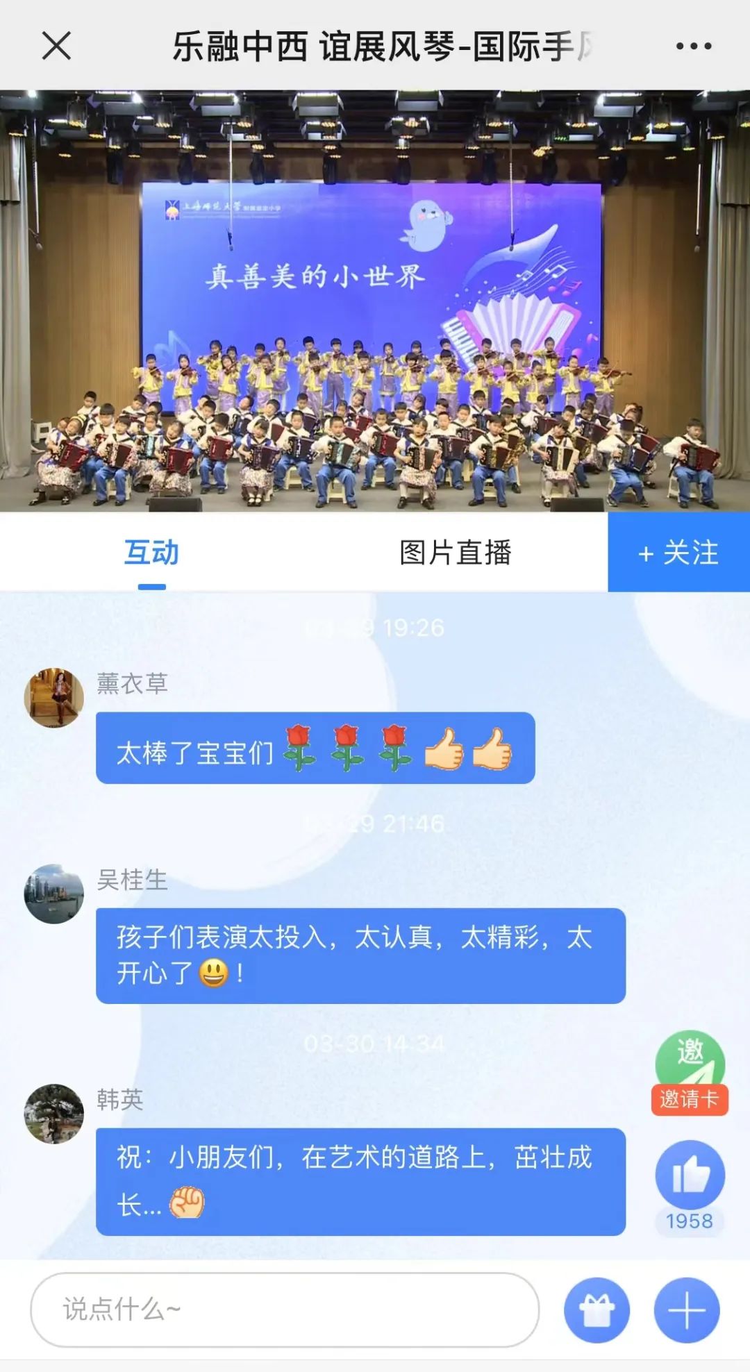 独属于手风琴音乐会的盛幕缓缓拉开,150多名小演员倾情演奏,与音乐之美相伴相随,为大家传递了真善美的温柔力量,让大家感受到了音乐之花极尽灿烂、青春向上之美,在幼小的心灵中栽下一颗爱音乐、爱世界的种子。上师嘉小精心策划的线上直播,让学校剧场内外将近五千名观众热情点赞互动,共同享受这场温馨浪漫的音乐盛宴。