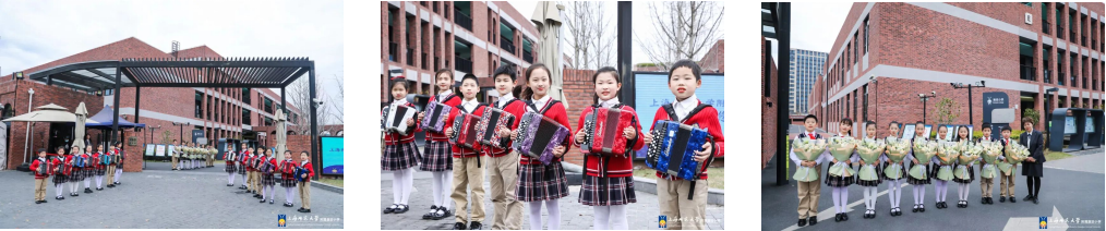 上师嘉小的手风琴迎宾队员和鲜花礼仪队员们精神抖擞地站在校门两侧,为远道而来的嘉宾们献上鲜花与祝福,表达衷心的感谢和诚挚的敬意,并在醉美校园门口合影留下珍贵的一刻。