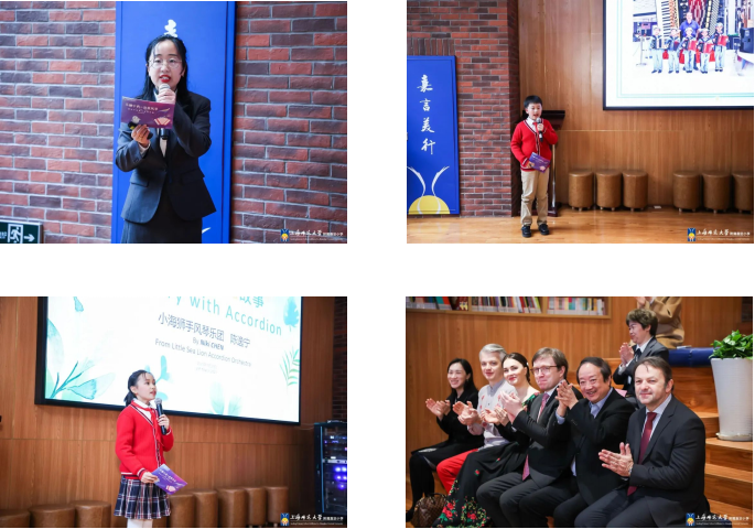 随后,作为优秀学员代表,三(2)班的管宇威、陈逸宁同学,向嘉宾们娓娓道来自己的“手风琴成长故事”,他们感谢学校的平台和乐团老师的悉心指导,用手风琴这一神奇的乐器奏响了属于自己的人生乐章。三位师生流利的英文互动赢得嘉宾们啧啧称赞,倾情分享的成长故事让嘉宾们对首家“上海手风琴艺术特色学校”满“新”欢喜。