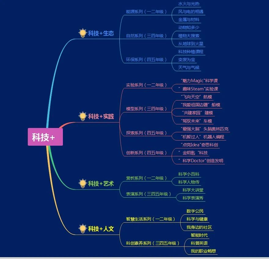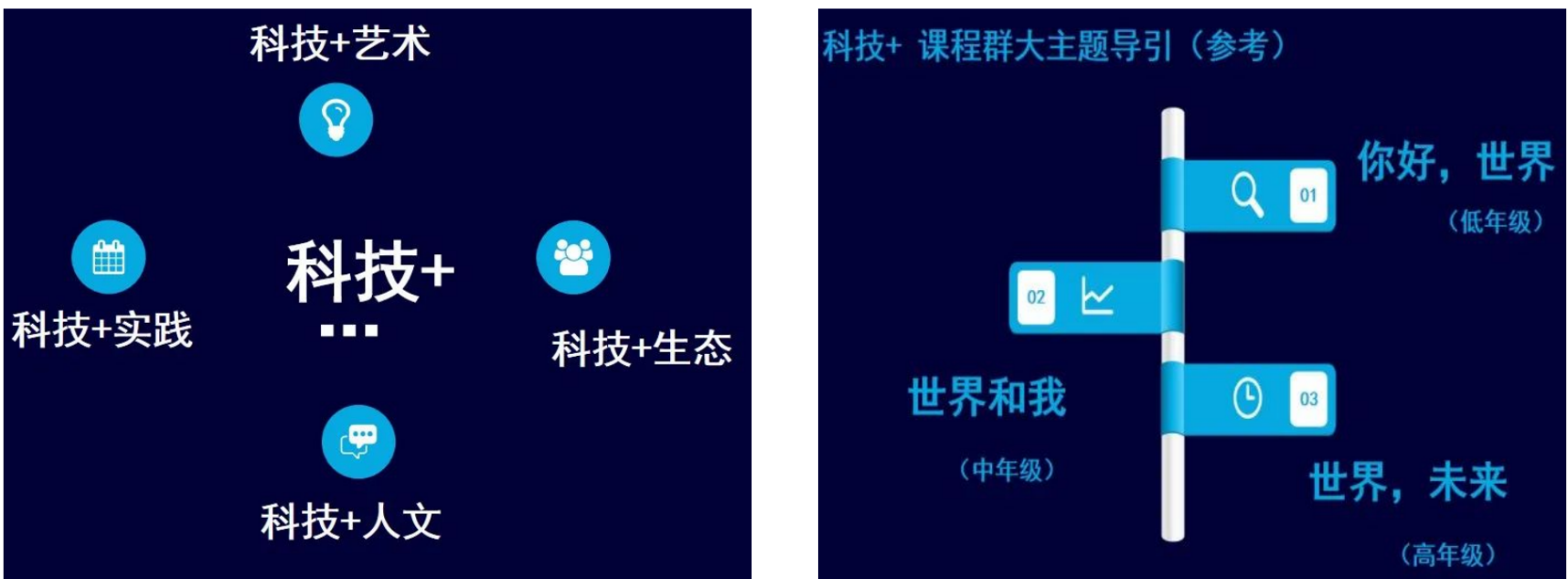 在共享 附属外国语小学优质课程资源的基础上,打造有品质的课程、有趣味的课程和有个性的课程。重点打造科技+特色课程和外语特色课程。科技+特色课程围绕“你好,世界”“世界和我”“世界,未来”三大主题,依托“科技+生态、科技+人文、科技+实践、科技+艺术”四大板块,培养学生的科技素养和创新素养。