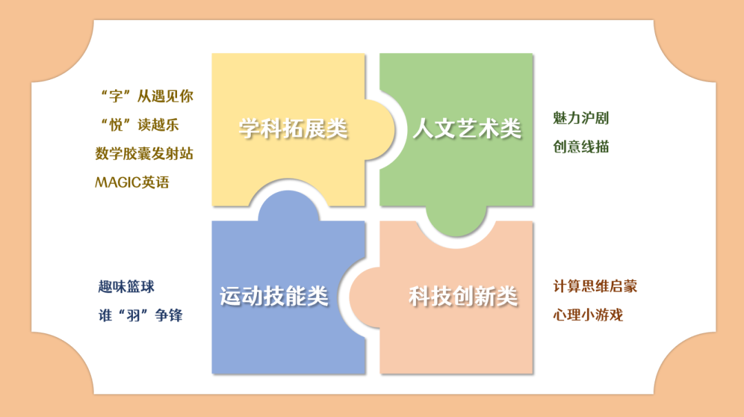 学校拓展课程共开设含人文艺术类、运动技能类、科技创新类、学科拓展类四个方向,上课时间安排为每周一14:45—16:15。