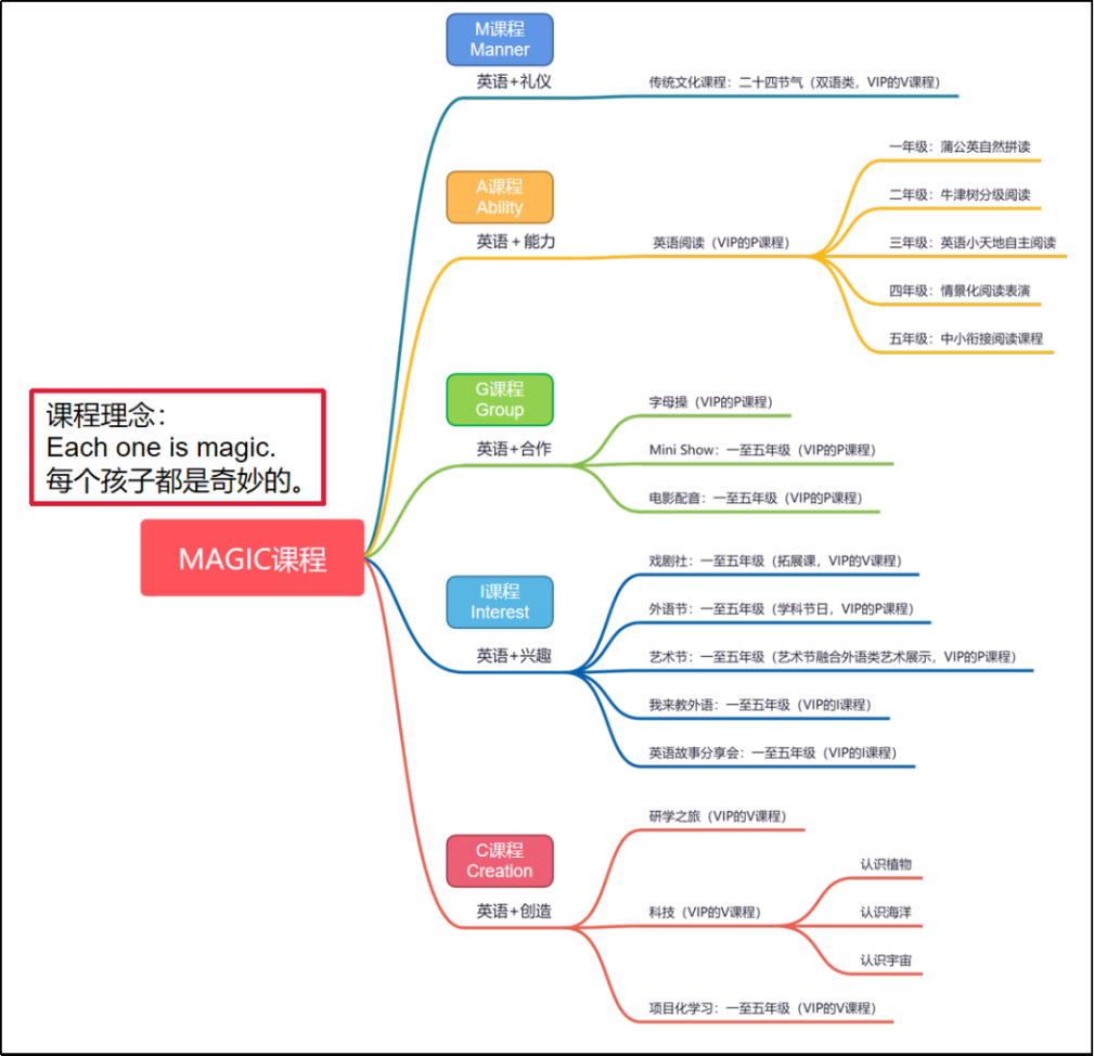 MAGIC外语特色由M、A、G、I、C五大板块课程组成。外语特色发展导图如下所示(图4):