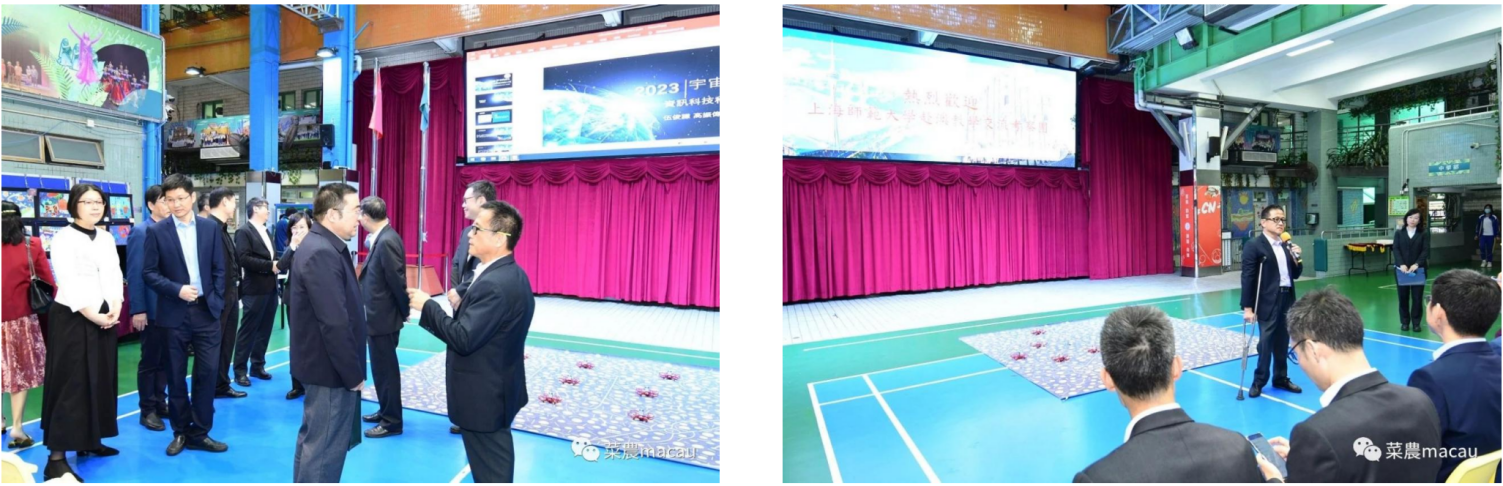 4月27日,学习交流团到访澳门菜农子弟学校,受到校长王国英、等行政人员的热情接待。不仅观看了中学机械人小组带来群飞多机“无人机”编队表演,还在该校今年刚成功保送到 应用心理专业的高三学生许家雯的陪同下,参观了学校天台特色生物园、学生体验耕作区和室内运动场。