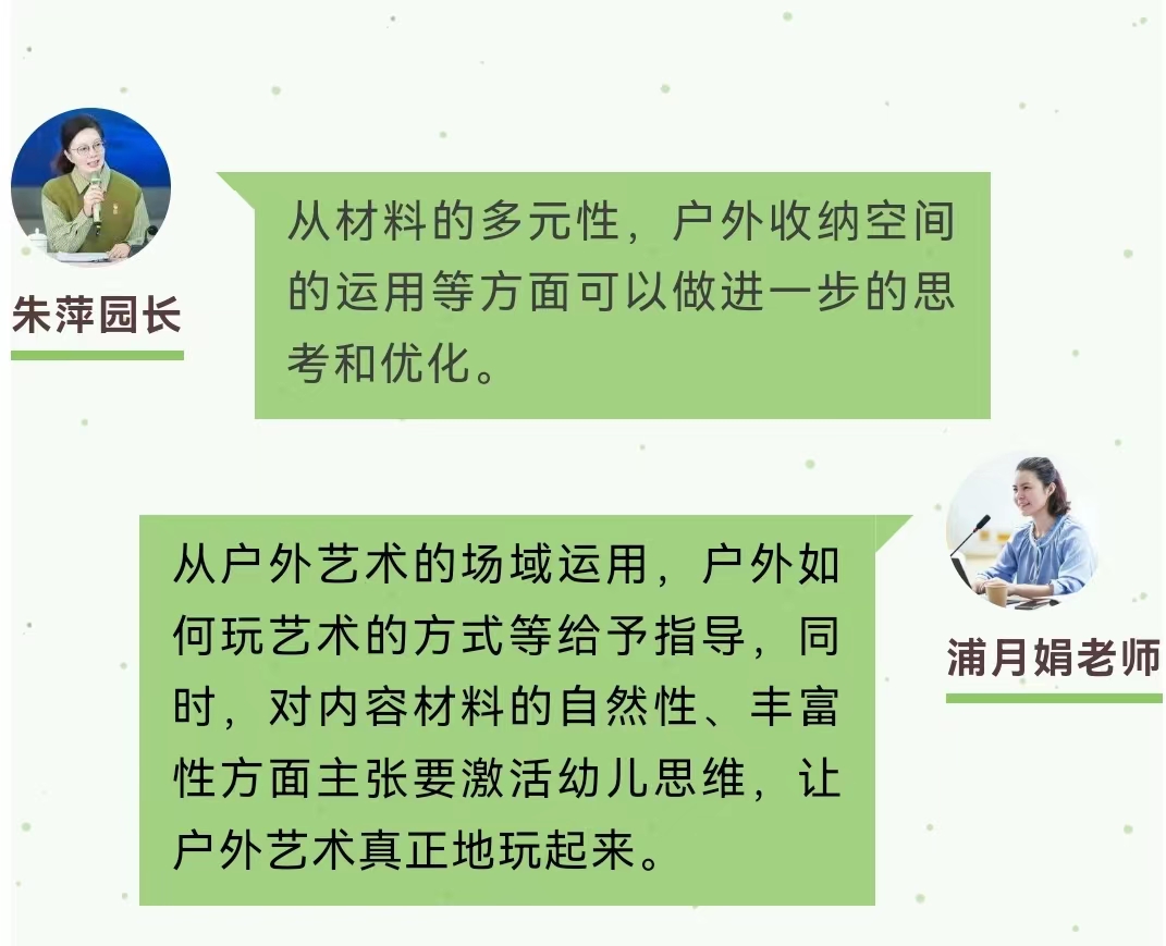 罗娜对整体户外环境创设的“儿童味”、不同区域内容设计和材料投放的适宜性等方面给出了一系列可行性建议。同时,鼓励教师进一步思考的是如何在与幼儿互动实践中不断反思与调整支持策略,放大儿童需求,弱化教师主导意识,在问题和需求中寻到课程的生发点。