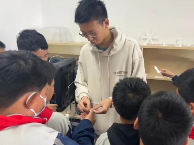 实验室中提供了3D打印机,激光切割机,学生们认真的观看高精度、稳定的3D打印建模步骤和基本操作,实现模型从虚拟到现实的单向转化,最后,学生们还获得了3D打印机打印好的上师大缩写名片,大家仔细看着打印出的物品,探究其中的奥秘。